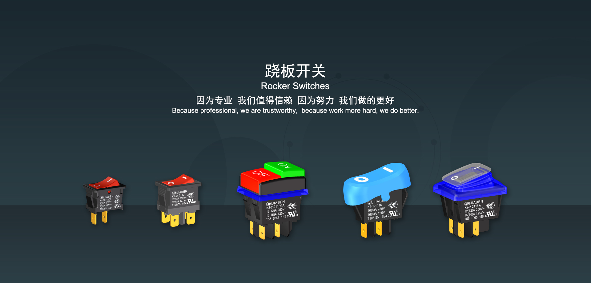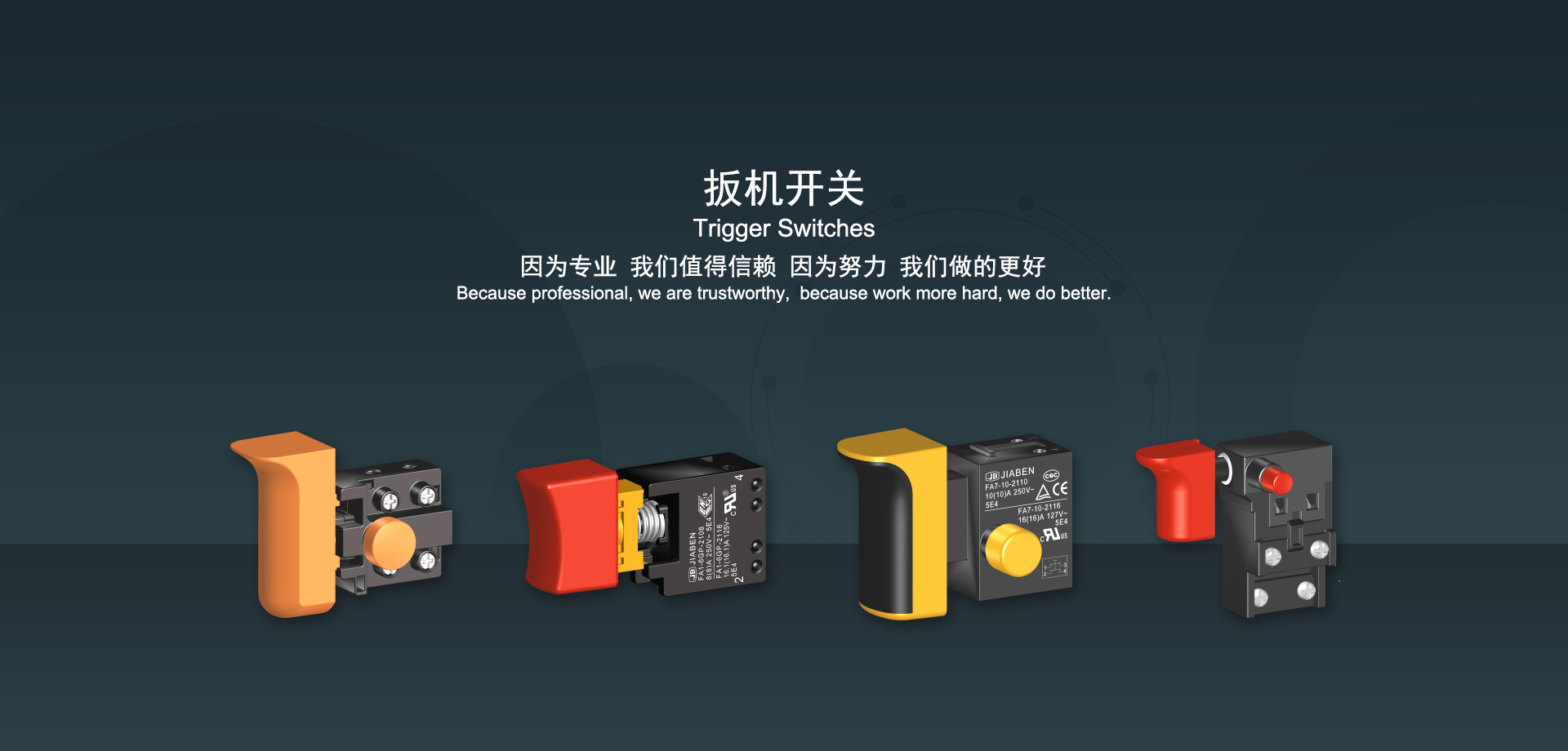 浙江佳奔電子有限公司始建于1986年,坐落于浙江省樂清市虹橋鎮(zhèn)東電子信息產(chǎn)業(yè)園內(nèi),現(xiàn)有職工700多人,資產(chǎn)總額超3億元。公司主要經(jīng)營“JIABEN”牌微動開關(guān)、蹺板開關(guān)、按鈕開關(guān)、扳機(jī)開關(guān)、調(diào)速開關(guān)和電位器開關(guān)等各類交、直流器具開關(guān)和各類交、直流線路板模塊等產(chǎn)品,主要應(yīng)用于交、直流電動工具、電動園林工具、清潔器具、家用電器和小型機(jī)床等行業(yè),是集產(chǎn)品設(shè)計、研發(fā)、制造、銷售和服務(wù)于一體的國家高新技術(shù)企業(yè)。JIABEN was founded in 1986, located in East Electronic Information Industry Park, Hongqiao Town, Yueqing City, Zhejiang Proviance, existing staff more than 700 peoples, more than 300 million RMB worth of assets. Company is mainly engaged in "JIABEN" brand Micro Switch, Rocker Switch, Push-button Switch, Trigger Switch, Speed Regulating Switch, Potentiometer Switch and other kinds of appliance switch and all kinds of AC or DC circuit board module, such as more than 100 series, 8000 kinds of models of products, mainly used in AC or DC Power-tools, Power Gardening Tools, Cleaning Appliances, Household Appliances and Small Machine Tool and other industries, is the collection product design, research and development, manufacturing, sales and service in one of the national high and new technology enterprise.